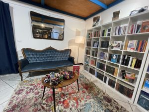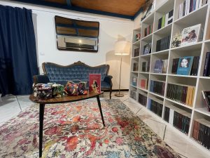 Il divano blu, ad esempio, una delle meraviglie di questo luogo, è pronto ad accogliere ospiti, autori, poeti, artisti e relatori. “L’ho preso in un mercatino con Francesca Serra (artigiana del posto che ridà nuova vita a materiali di recupero trasformandoli in piccole opere d’arte legate alla tradizione sarda, ndr)”. Serra ha anche messo lo zampino in un’altra meraviglia della Giraffa: la cassetta delle lettere. Pronta per ospitare lettere vere, scritte di proprio pugno su carta da parte di chiunque vorrà dedicare un pensiero, una riflessione su un libro o sulla libreria (l’indirizzo è piazza Martiri n. 12, 09010 Siliqua).