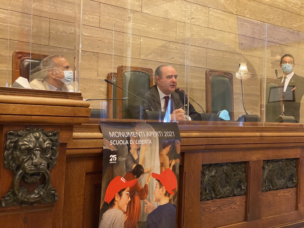 Il programma di Cagliari Monumenti Aperti è stato presentato mercoledì 10 novembre con una conferenza stampa nell’aula del Consiglio Comunale, in via Roma, alla presenza dell’assessore al turismo Alessandro Sorgia, dell’assessora alle politiche giovanili Rita Dedola e del presidente di Imago Mundi, Massimiliano Messina (nella foto di copertina).