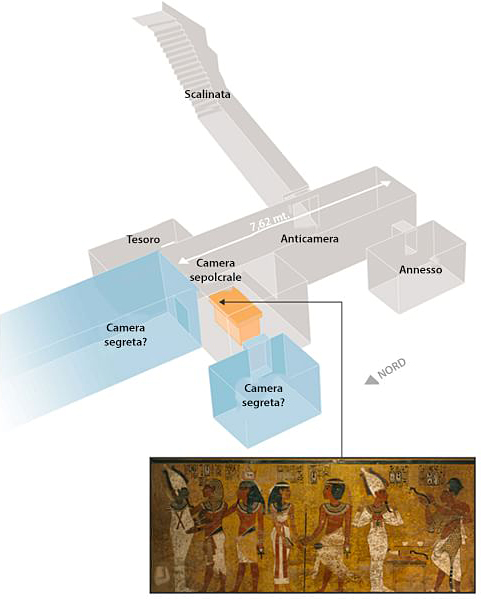 Pianta della tomba di Tutankhamon. fonti: Theban Mapping Project, Ministero delle Antichità, Egitto; fotografia di Kenneth Garrett