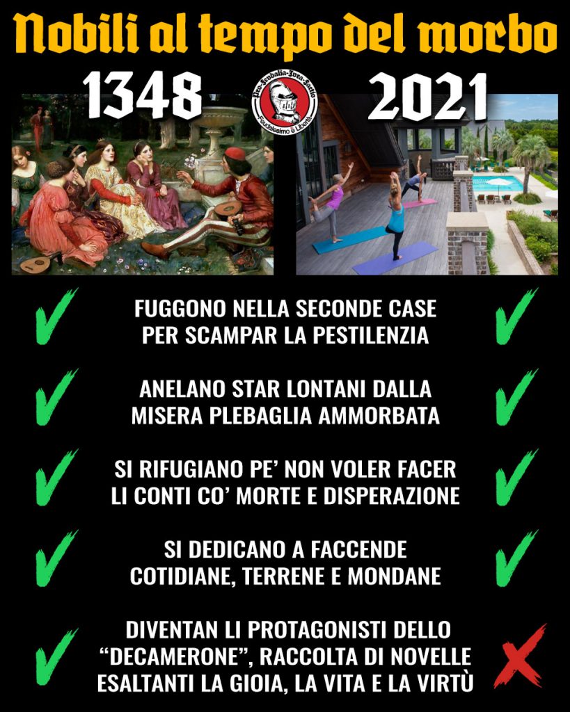 Nei momenti di crisi sociale ed economica, è justo che chi pote permettersi de fuggir da malanni e carestie lo faccia. Noi, da veri difensori della nobilitade, incentiviam tutti li signorotti a chiuder lo ponte levatoio, facendo valer ‘l proprio status di superiorità per diritto divino. È meglio scappar dalla vista del poverello infetto a bordo via e non dover facer di conto co’ la propria coscienzia, che essendo humana, è fallace per natura. Di contro però, durante i tempi del savio Boccaccio, vedevamo come i nobili al tempo dello Morbo si rifiugiassero lontani dalla marmaglia plebea pe’ dedicarsi all’otium litterae tanto da divenir li protagonisti dello Decamerone, una raccolta di novelle ch’esaltano la gioia per la vita e le vere virtù. Di contro, ‘l nobile moderno, avendo cogitato tutta la vita solo al vil danaro (sterco del demonio), trascorre li periodi di quarantena sulmente a trangugiar cibi d’asporto et giuocar allo computatore sanza contribuir in alcun modo alla lecteratura o all’igiene morale della società.