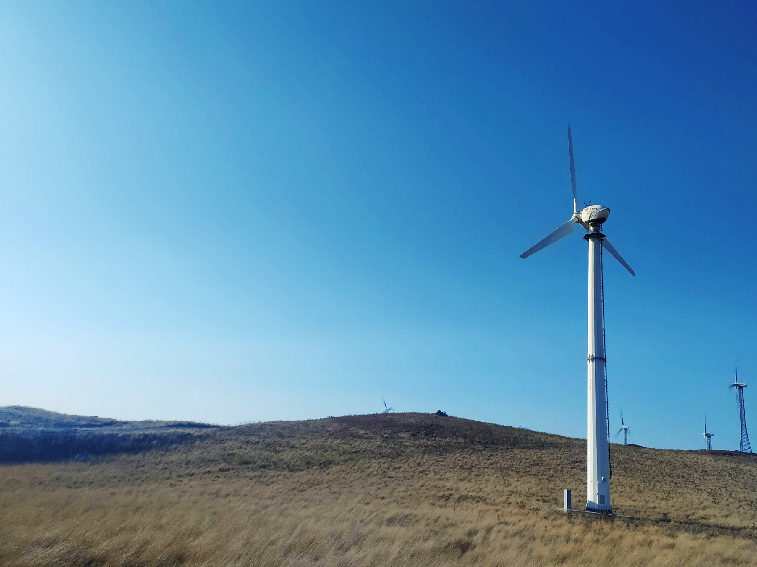 Una grande pala eolica nell’assolata campagna sarda. La foto è di Francesca Mulas