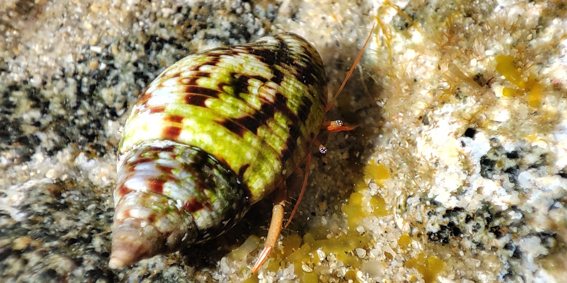 Il paguro è un crostaceo con addome molle che colma questo difetto utilizzando come protezione il guscio vuoto delle conchiglie abbandonate. La foto ritrae il paguro zamperosse o anche detto paguro diavolo, uno dei più piccoli esemplari della sua specie. La foto è stata scattata nella spiaggia di La Punta a Carloforte.