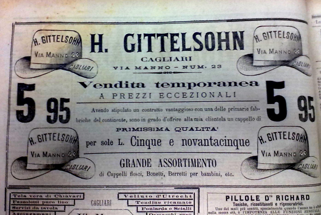 Questi erano i Grandi Magazzini – talvolta “grandissimi” e “magazzeni” -, del signor Ermanno, che declamava la sua merce ai primi arrivi delle novità di stagione garantendo i suoi prezzi ultraconvenienti e “modicissimi da escludere ogni concorrenza”. Probabilmente fu uno dei primi store cittadini che per decenni conquistò il favore dei cagliaritani e fece conoscere il nome Gittelsohn ben oltre le mura cittadine.
