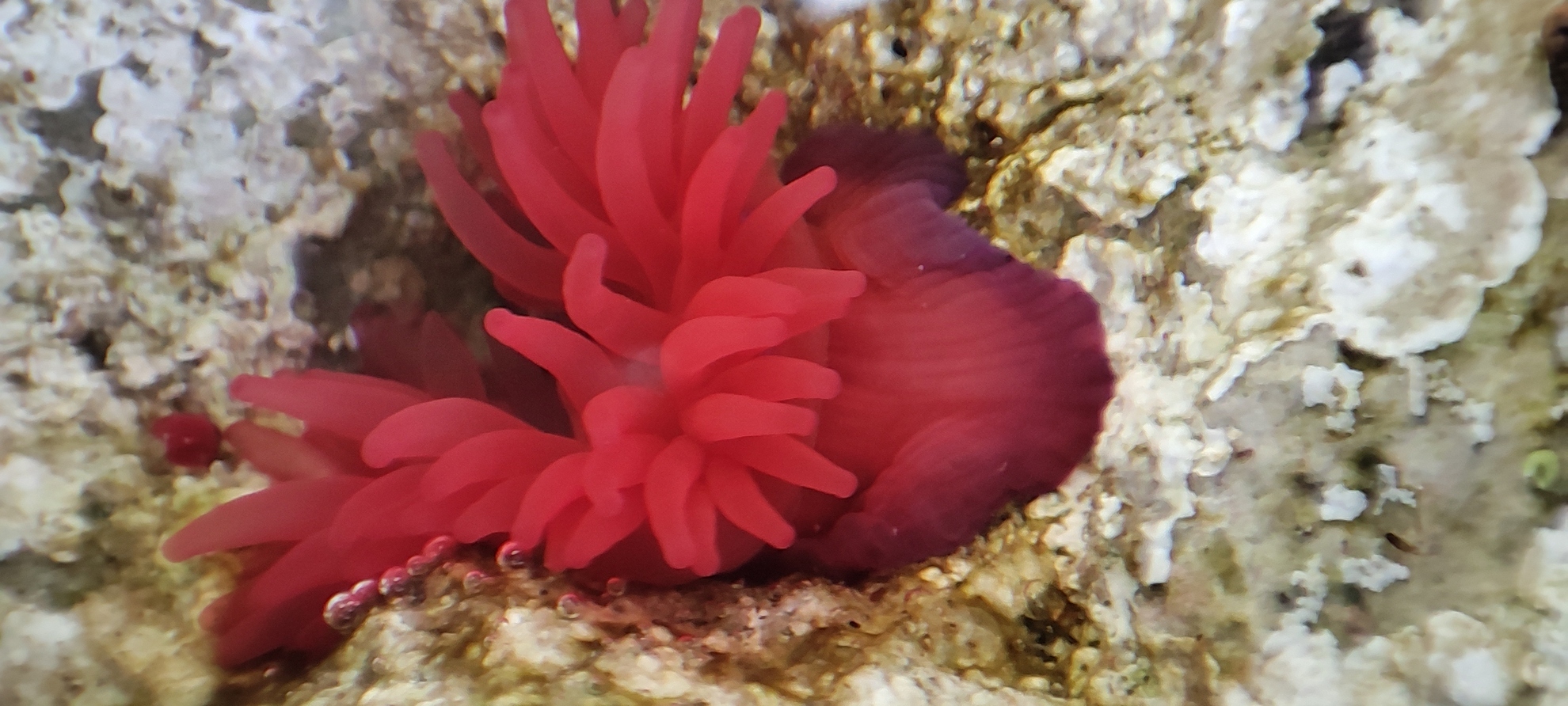 Una piccola anemone di mare conosciuta col nome di Actinia equina o più comunemente pomodoro di mare. E’ un piccolo animale che con i suoi tentacoli urticanti si nutre di molluschi e piccoli pesci. La foto è stata scattata a Calafico nell’isola di Carloforte.