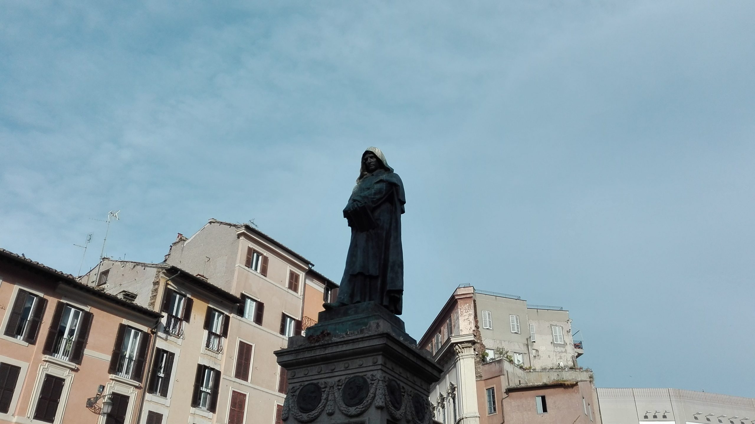 Nella piazza del suo martirio, sorge ancora il monumento che lo ricorda. Dal 1889 rappresenta la protesta della ragione contro coloro che vorrebbero strozzarla a favore del dogma e l’ammonimento ai seguaci delle tenebre del passato, del fanatismo e del fondamentalismo. A Roma, la sua presenza assunse da subito il valore aggiunto di un’implicita e severa condanna al potere temporale e spirituale dei papi (Leone XIII minacciò di abbandonare la capitale per rifugiarsi in Austria, qualora la statua fosse stata scoperta al pubblico) e ha resistito ai ripetuti assalti del cattolicesimo più oscurantista, menzognero e reazionario anche dopo i Patti Lateranensi di epoca fascista.