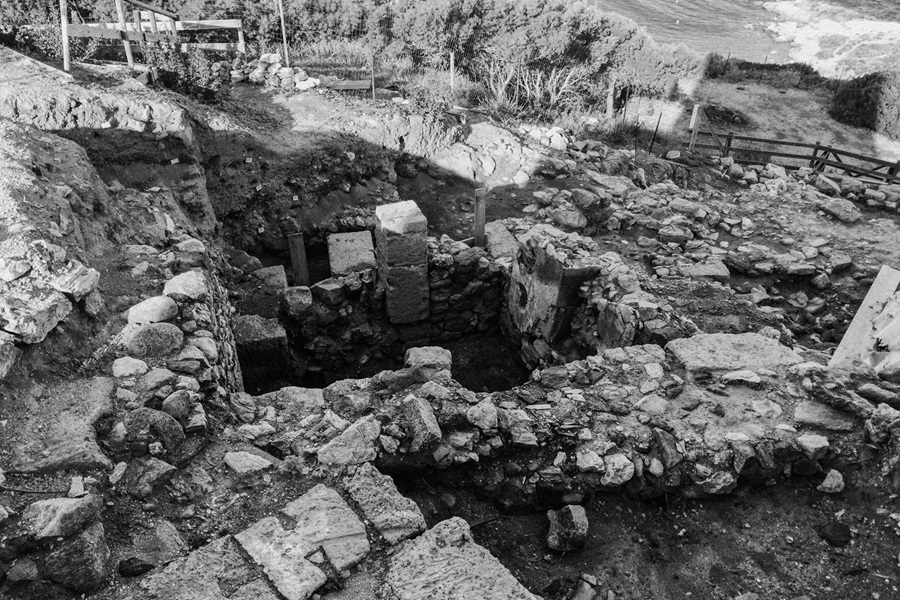 L’eroina spumeggiava ancora nella siringa di una delle due persone che vi trovammo sedute, in quel tempio. Insieme al sangue, che defluiva dalla vena trafitta sul braccio sinistro della donna piedi di gomma. Furono attimi, furono sorprese dalla nostra presenza. Imbarazzo il loro, la paura la nostra. O forse il contrario, quasi avessero visto le genti dai vestiti color porpora, di nuovo, ancora. Andare a bucarsi nel luogo meno conosciuto di una costa, dentro un tempio di phoinikes abbattuto su di un’isola a forma di pane, quasi fosse un rito, per poi essere sorprese da due curiosi in cerca di avventure e ritrovamenti? No, non doveva essere stato nei loro programmi.