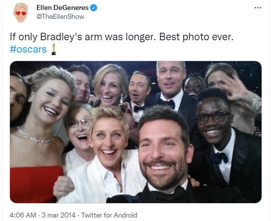 Da quest’anno esiste anche un premio “social”, attribuito alla pellicola più votata su Twitter. Potranno concorrere anche film non ufficialmente in nomination, e tre votanti verranno estratti per un viaggio premio a Los Angeles per partecipare alla cerimonia del 2023. Che si tratti di puro affetto verso un pubblico entusiasta o una strategia di marketing, l’iniziativa è stata apprezzata dai cinefili di tutto il mondo. Durante l’86esima edizione, nel 2014 Twitter “crashò” per i re-tweet (3,4 milioni) del selfie improvvisato dalla conduttrice Ellen DeGeneres con dieci attori. Il famoso selfie, immediatamente postato con l’hashtag #oscar e la didascalia “If only Bradley’s arm was longer” è stato definito dal Times come una delle cento foto che hanno cambiato il mondo.