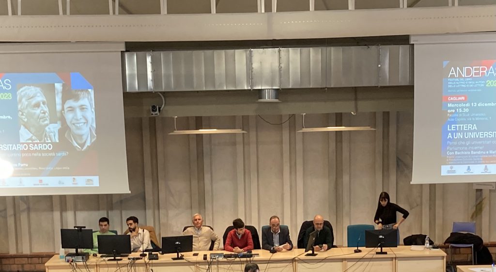 Così si apre ‘Lettera a un universitario sardo’ (2023, Quaderni della Fondazione Sardinia), il saggio dello scrittore, antropologo e giornalista sardo Bachisio Bandinu presentato mercoledì sera a Cagliari nell’Aula Capitini di Sa Duchessa durante un incontro con gli studenti e le studentesse dell’Università di Cagliari. L’evento, organizzato in collaborazione con Kita assotziu universitariu, ResetUnica, Lingue Unica Fondazione Culturale Sardinia e Stupore, si inserisce nel ricco programma della seconda edizione di Anderas, il festival letterario in programma dal 5 al 19 dicembre tra Selargius, San Gavino Monreale, Cagliari e Pirri, promosso dalla Fondazione Faustino Onnis. Oltre a Bandinu, a moderare l’evento c’erano anche il giovane scrittore Matteo Porru, il docente universitario e attivista politico Franciscu Sedda,il docente universitario Duilio Caocci, Matteo Da Pelo, presidente di Stupore e Alessio Marras, rappresentante degli studenti e le studentesse dei corsi di Lingue e membro dell’associazione universitaria Kita.