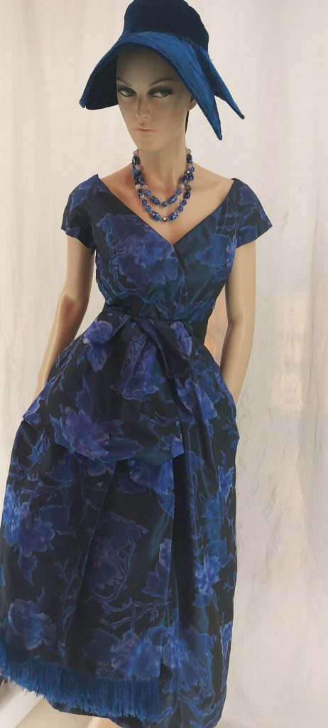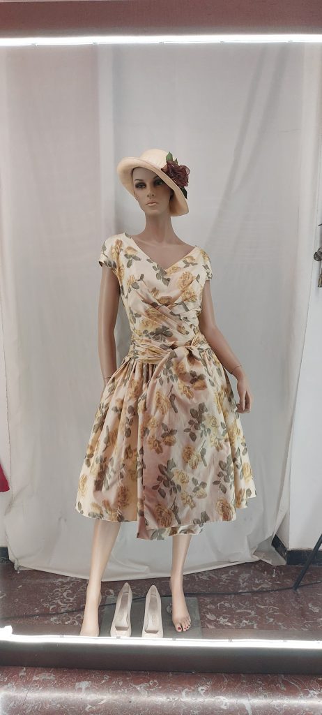 Nella seconda sala, ad attenderci, ci sono due Christian Dior originali degli anni ’50 e una borsa d’epoca Gucci caratterizzati dal tema della rosa. Tessuti e modelli che hanno mantenuto la loro eterna eleganza, per nulla scalfiti dal passare del tempo. E qui ancora creazioni di Bonino in cui il fiore ricorre in ombre, in ton sur ton, oppure gridato con colori cremisi e viola di grande intensità su kimoni, vestiti lunghi, abiti da pomeriggio.