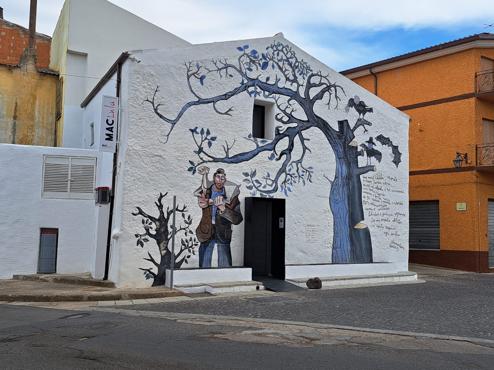 Per la ristrutturazione della casa dipinta e di altri due immobili che si affacciano alla piazza – uno dei quali frutto di donazione – la coppia ha istituito un concorso di idee, vinto dall’architetto padovano Luca Zecchin. Vetrate a tutta parete, geometrie rigorose, convivenza di bianco e toni scuri, e l’iconico murale ambientalista, oggi restaurato, a prendersi la scena: il MACLula, nuovo incubatore di arti visive a vocazione internazionale, diventa realtà. Tra le opere esposte, visibili dalle vetrate illuminate anche la notte, convivono Alberto Burri e Yoko Ono, Maria Lai e Pinuccio Sciola (presente con un’opera concessa in comodato dalla famiglia), Giovanni Canu e Silvia Argiolas, che Fumagalli ama particolarmente: “Nella sua arte si esprime il pensiero di una donna autenticamente libera e autodeterminata. Mi ricorda il mio ’68, vissuto a Milano”.