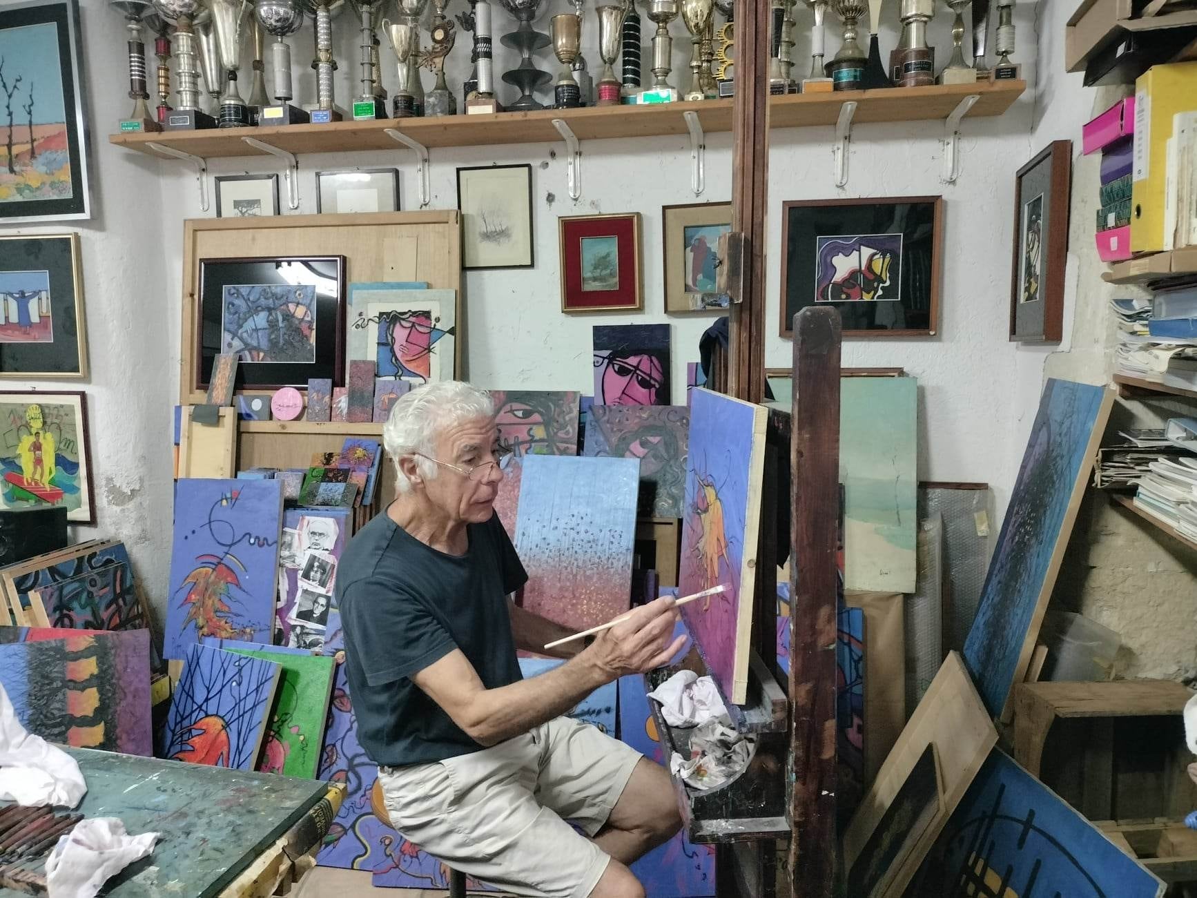Dare parola alle proprie pennellate è sempre stata la sua cifra stilistica, il suo modo per comunicare. Un’aspirazione frutto di sensibilità ed empatia, che non mira alla facile ricerca di lusinghe, spesso ingannatrici. Piero Ligas è uno dei pittori più suggestivi di Cagliari, capace di rendere concreta l’astrazione: settantacinque anni nato a Nurri e poi trasferitosi nel capoluogo, dipinge dal 1964 e dal 2001 ha il suo laboratorio in via Lamarmora, nel cuore del quartiere di Castello, qualche metro dopo il Portico delle Grazie all’imbocco della via. “Dove adesso ho il mio studio – rivela – c’è stato il primissimo tabacchino della città”.