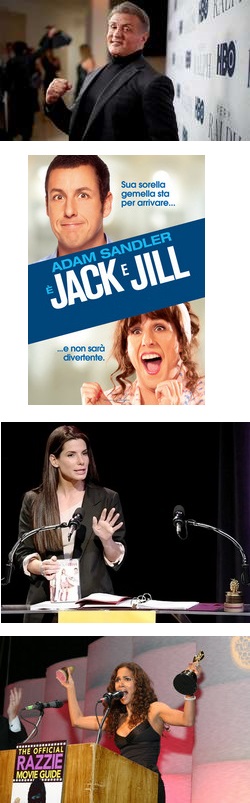 (In ordine dall’alto, Sylvester Stallone, la locandina del film ‘Jack e Jill’, Sandra Blullock e Halle Berry alla premiazione dei Razzie)