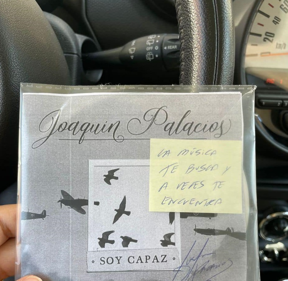 Joaquin Palacios, classe 1975, cantautore nato a Siviglia, si definisce come un postino che consegna musica lungo i percorsi della sua quotidianità. Il senso di questo gesto è molto legato all’immaginazione del tragitto e delle distanze che le sue canzoni, in questo modo, possono prendere. Succede anche a Cagliari, il CD (nella foto a destra) è stato lasciato sulla macchina di Laura di Tucci con un messaggio in spagnolo: “La musica ti cerca e vedrai che ti trova”.