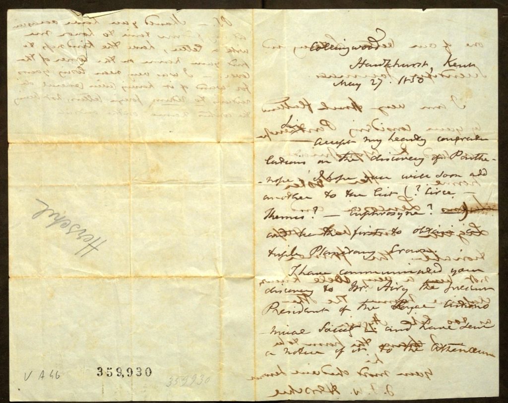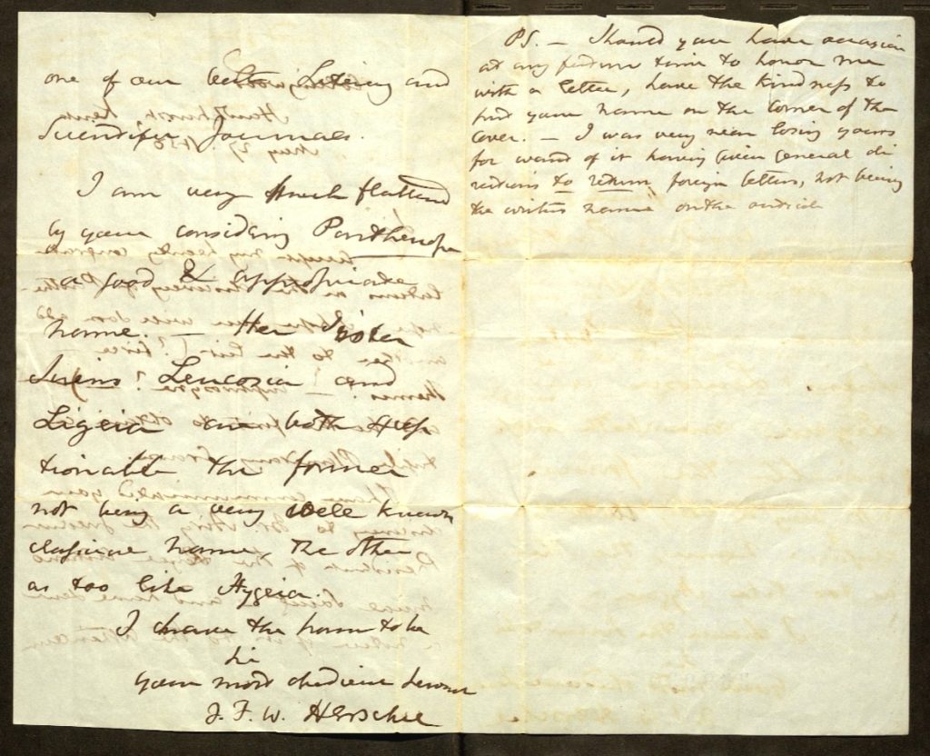 Tra le missive spicca quella del 27 maggio 1850 indirizzata a de Gasparis da John Herschel, celebre autore di un catalogo di stelle multipli e doppie nonché figlio dell’ancor più noto William, scopritore nel 1781 del pianeta Urano, nella quale lo scienziato inglese si complimenta con lui per la scoperta di Parthenope, il secondo asteroide individuato, ringraziandolo per avergli dato il nome da lui proposto e augurandogli di poterne scoprire subito un terzo per conquistare una “tripla corona planetaria”, diventando tra i primi scienziati al mondo ad avere scoperto tre pianeti. Cosa che accadde sei mesi dopo, con la individuazione da parte di de Gasparis di Egeria.